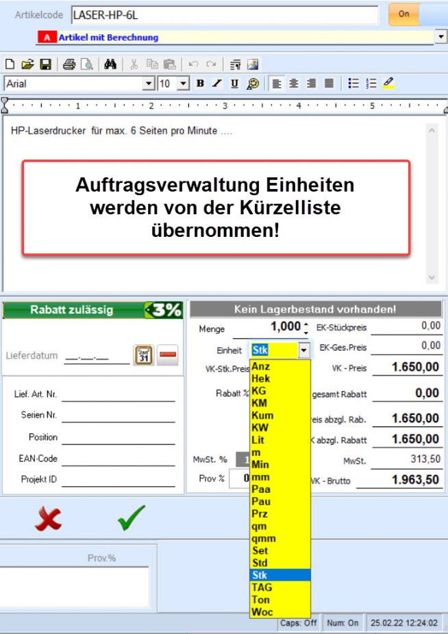 Um Eingabefehler zu vermeiden werden die Einheiten in der Kürzel-Tabelle angelegt und können dann zur Auswahl in der Auftragsverwaltung übernommen werden.