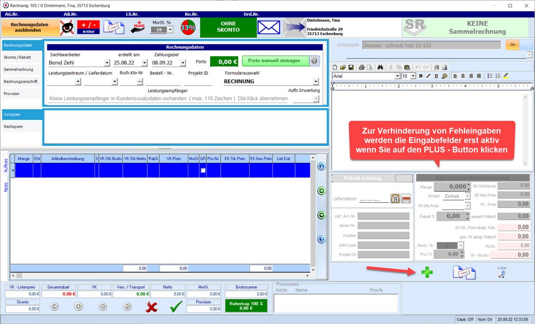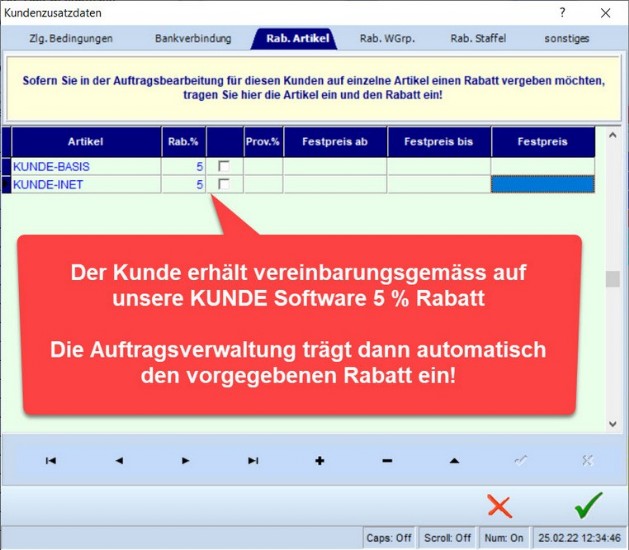 In den Kundenzusatdaten können Sie dem Kunden einen Rabatt auf eine ganz bestimmte Artikel hinterlegen.