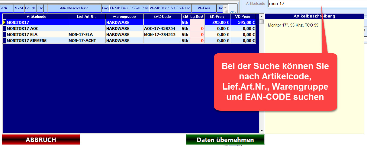 Die Artikelsuche hat auf Wunsch einiger Anwender die Spalte EAN-CODE zum Suchen dazu bekommen.