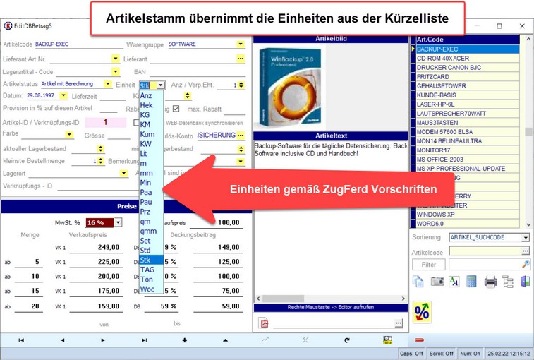 Um Einheiten stehen Ihnen dann auch im Artikelstamm zur Verfügung bzw. zur Auswahl