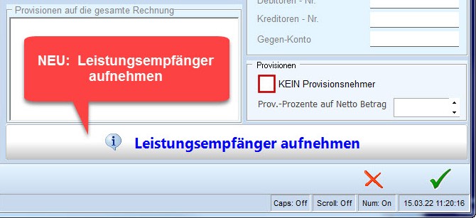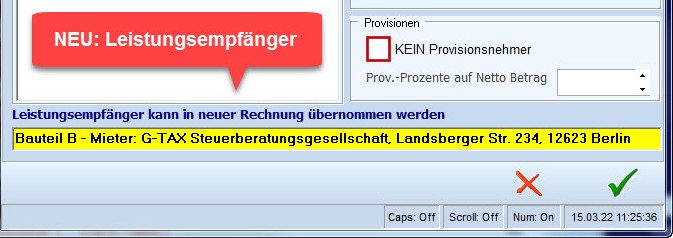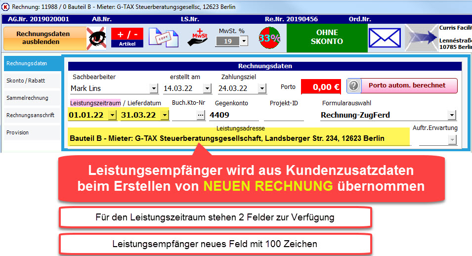 Sofern Sie in den Kundenzusatzdaten einen Leistungsempänger eingetragen haben, wird dieser beim Erstellen einer neuen Rechnung automatisch übernommen. Selbstverständlich können sie diese Adresse überarbeiten bzw. abändern.