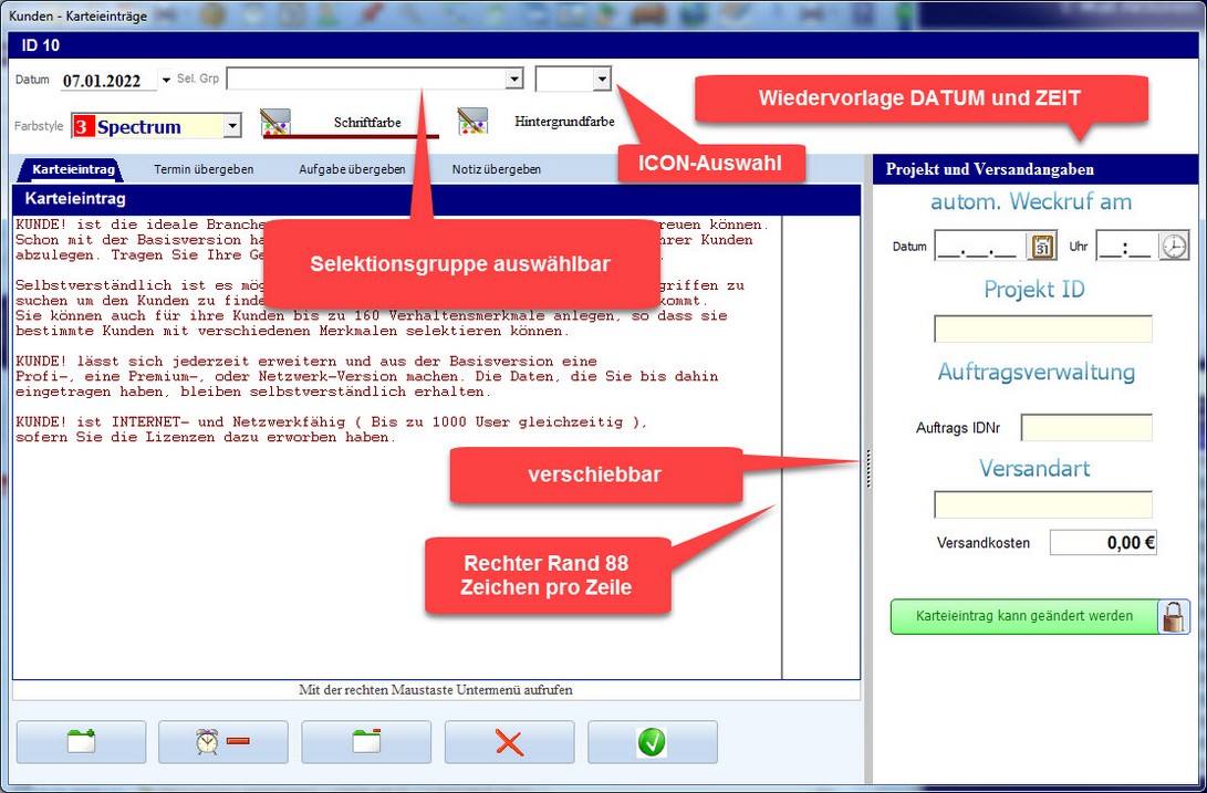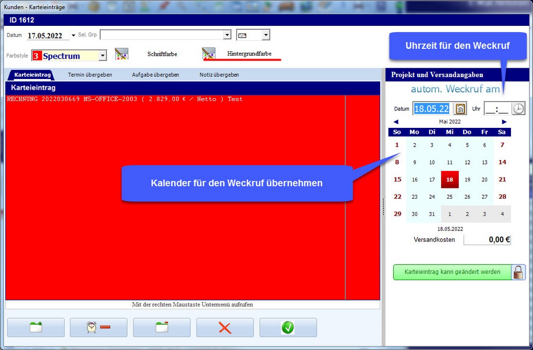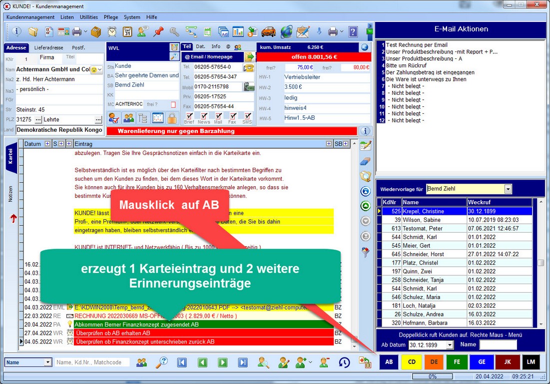 m das zu kontrollieren müssen Sie zuerst einen Karteieintrag eingeben, den 1. Weckruf zur Überprüfung ob der Vertrag erhalten wurde. Den 2. Weckruf ob der Vertrag unterschrieben zurück gesendet wurde.Diese 3 Einträge können Sie in KUNDE! jetzt automatisieren und mit 1 Mausklick auslösen.