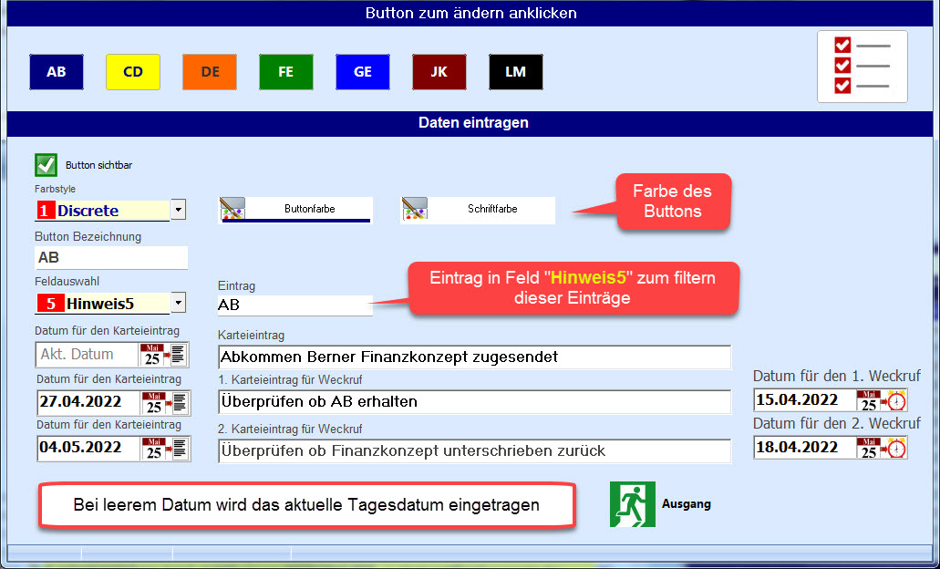 m das zu kontrollieren müssen Sie zuerst einen Karteieintrag eingeben, den 1. Weckruf zur Überprüfung ob der Vertrag erhalten wurde. Den 2. Weckruf ob der Vertrag unterschrieben zurück gesendet wurde.