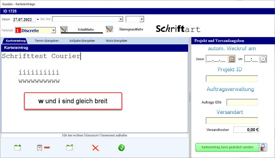Durch Eingabe dieses Kürzels in der Kartei wird dann der hinterlegte Satz aus dem Kürzelsystem übernommen und eingetragen.