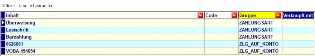 Im Kürzelsystem können Sie beliebig viele ZAHLUNGSART(en) und ZLG_AUF_KONTO ( Konten und Kassen ) eintragen, die Ihnen dann zur Auswahl für den Zahlungseingang zur Verfügung stehen.
