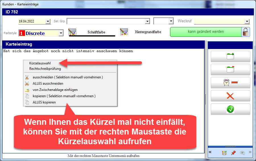 Mit den Kürzelsystem können Karteieinträge schneller und einfacher eingetragen werden.