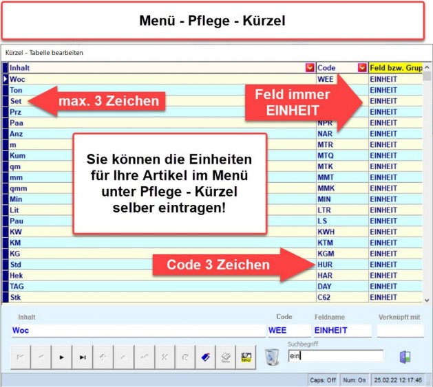 Die Einheiten verwalten Sie im Menü - Pflege - Kürzel