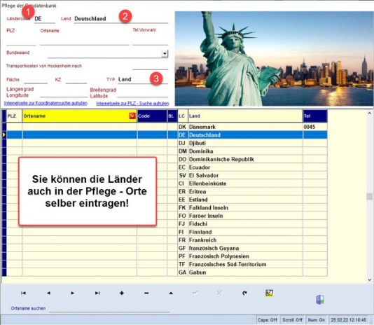 Sie können sich hier die Ländertabelle runterladen und mit dem KUNDE! - Import Programm in die Orte Datenbank einlesen.