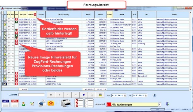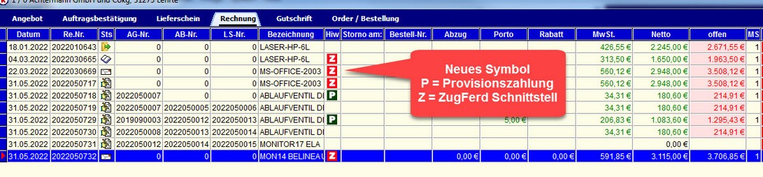 In der neuen Rechnungsübersichtsliste werden Provisionsrechnung mit einem grünen P-Icon
