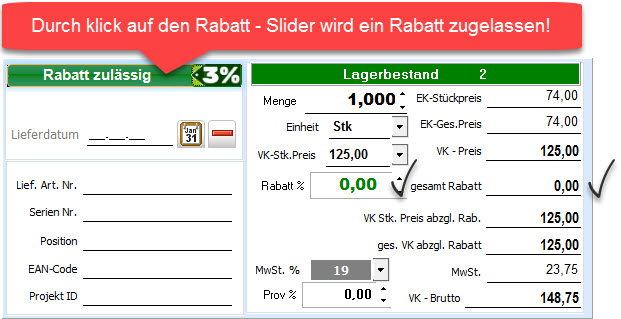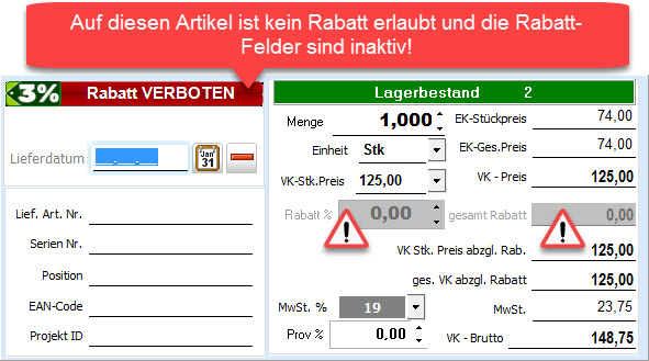 Wenn auf einem Artikel kein Rabatt zugelassen werden soll, dann wird dieser Artikel für Rabatte gesperrt und es erscheint auf dem Slider "Rabatt VERBOTEN" und die Rabatt Felder sind inaktiv!