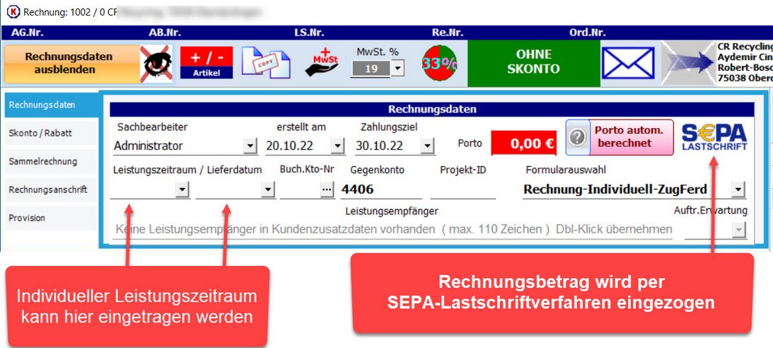 Durch die weiter unten beschriebenen Erweiterungen wie Leistungsempfänger und Leistungszeitraum können die Auftragsformulare optimiert bzw. erweitert werden.