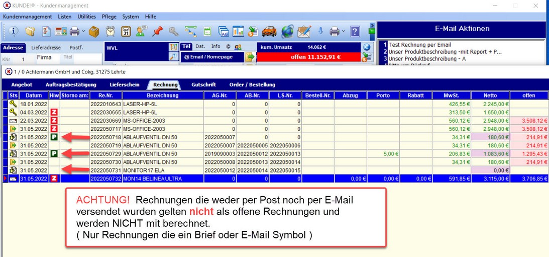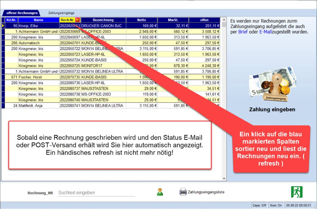 Die Auftragsverwaltung aktualisiert auch sofort Rechnungen die per E-Mail gesendet werden in die Offenen Rechnungen übersicht