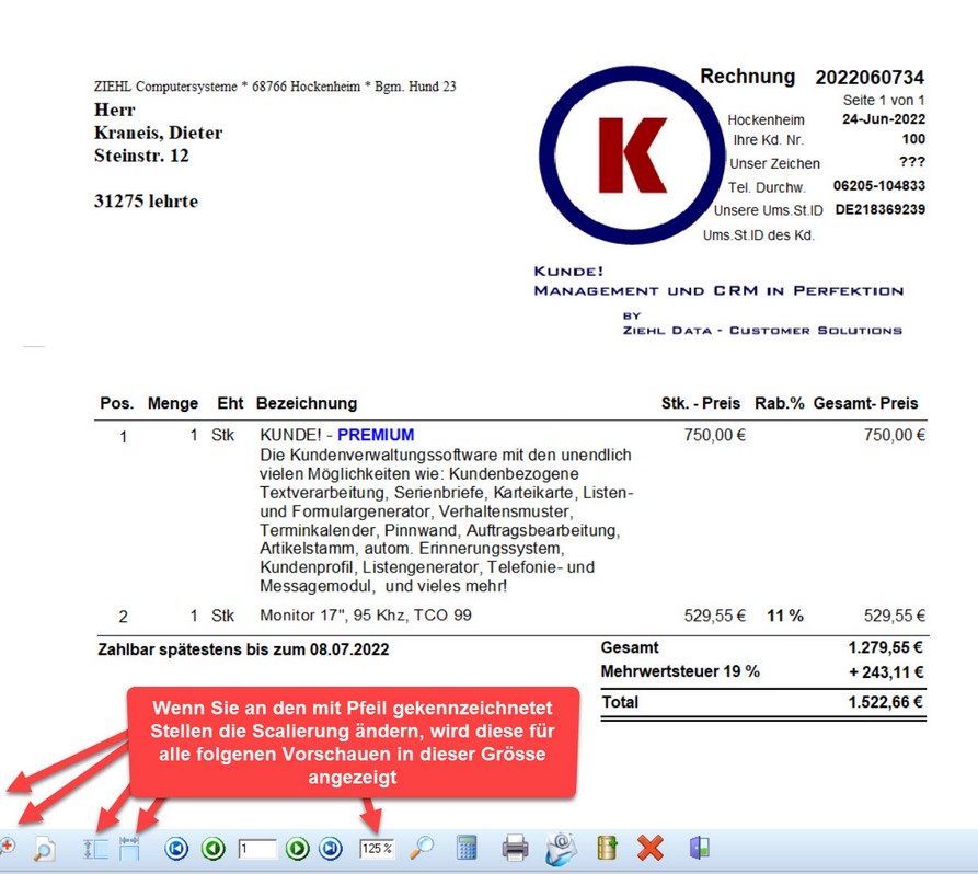 Die Reportvorschau in der KUNDE! - Auftragsverwaltung 2021 behält die Grösseneinstellung