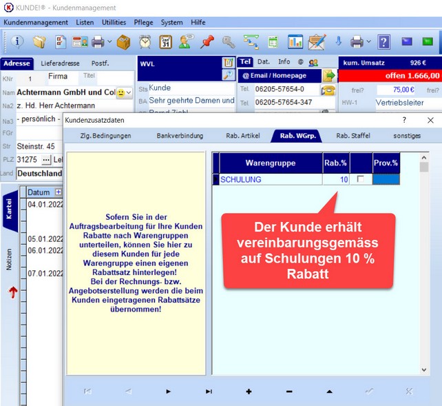 In den Kundenzusatdaten können Sie dem Kunden einen Rabatt auf eine ganz bestimmte Warengruppe hinterlegen.