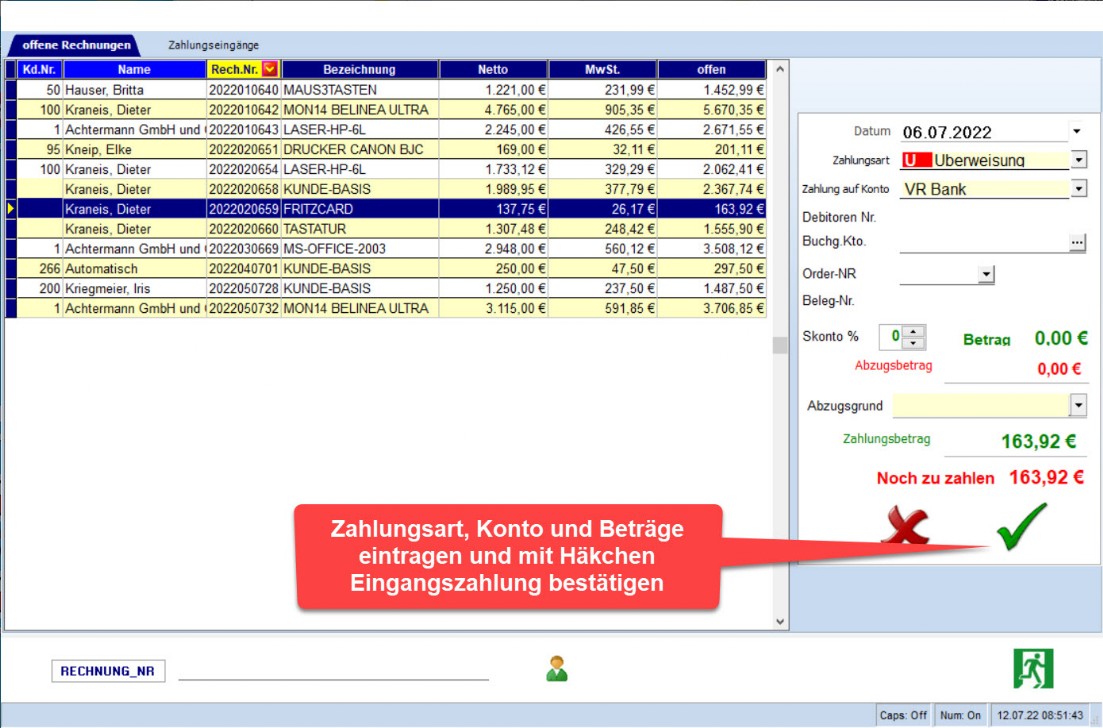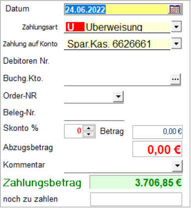 Wenn Sie nur eine Zahlungsart und 1 Konto für die Zahlungseingänge zur Verfügung haben, wird von KUNDE! automatisch die Zahlungsart und das Zahlungskonto vorgegeben.