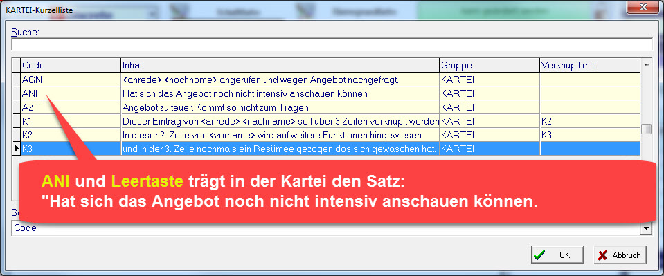 In der kartei "ani" eintippen. Wenn die Leertaste folgt dann wird der Inhalt aus dem Kürzelsystem übernommen.