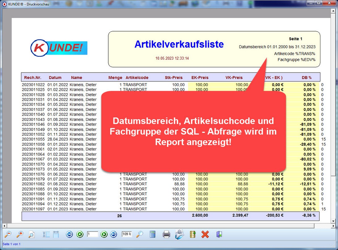Die Artikelliste übergibt folgende Parameter an den Report so dass Sie auf dem Report den Datumsbereich, den gesuchten Artikelcode und die gesuchte Fachgruppe angezeigt bekommen können.