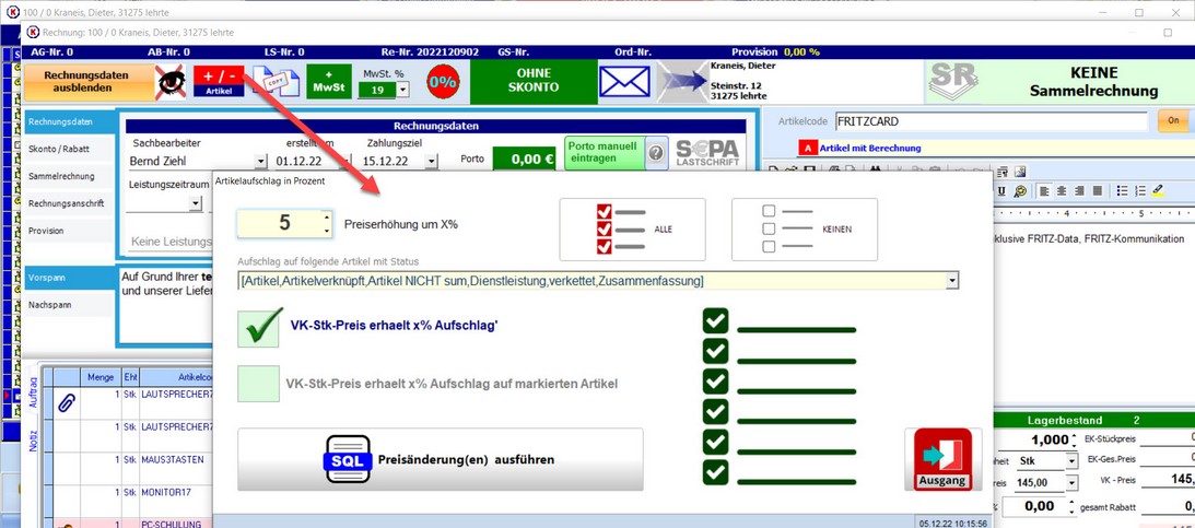 mit diesem Modul können Sie VK-Preise in einer vorhandenen Rechnung für einen oder alle Artikel um x% erhöhen