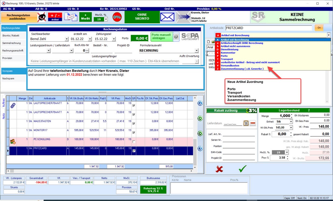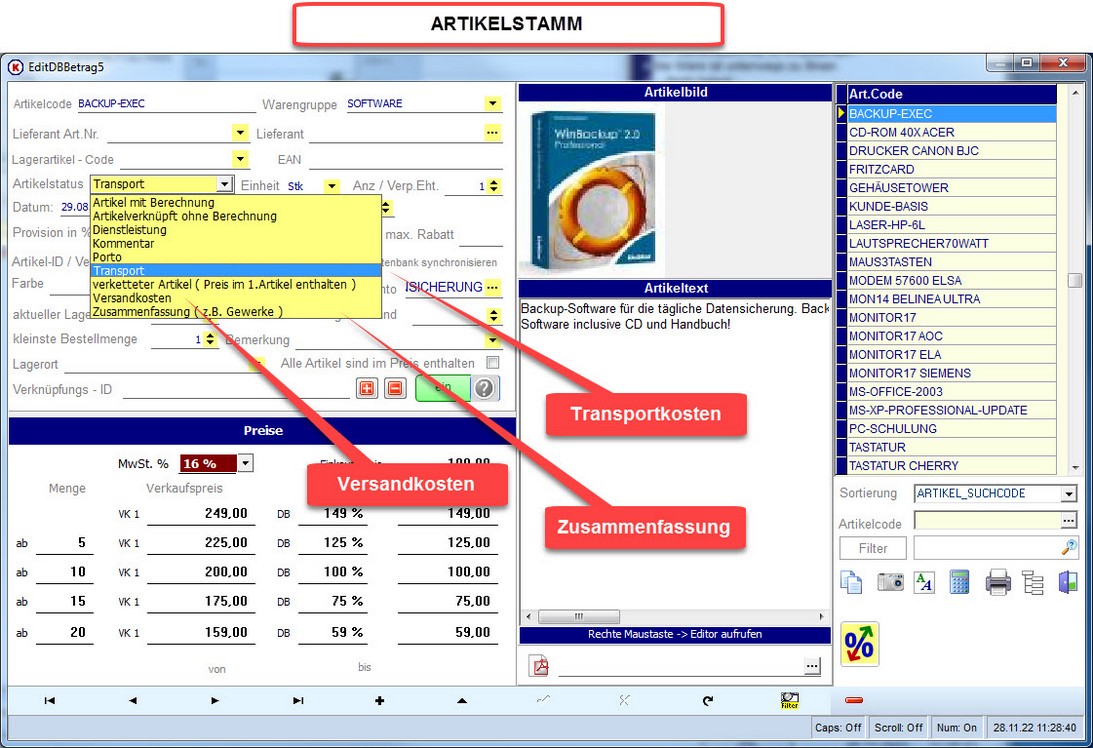 Setzen Sie also den Artikelstatus für die Transportkostenberechnung auf "T" oder den Statusartikel für Versandkosten auf "V"