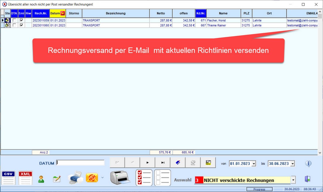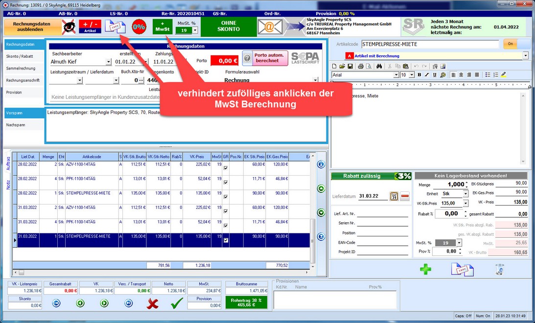 Das Senden einer Rechnungsmail aus der Rechnungsübersicht funktionierte nicht wenn keine BCC ( blind carbon copy ) Adresse vorhanden war.Dieser Fehler wurde mit diesem Update korrigiert!