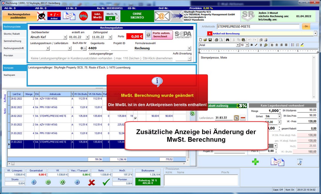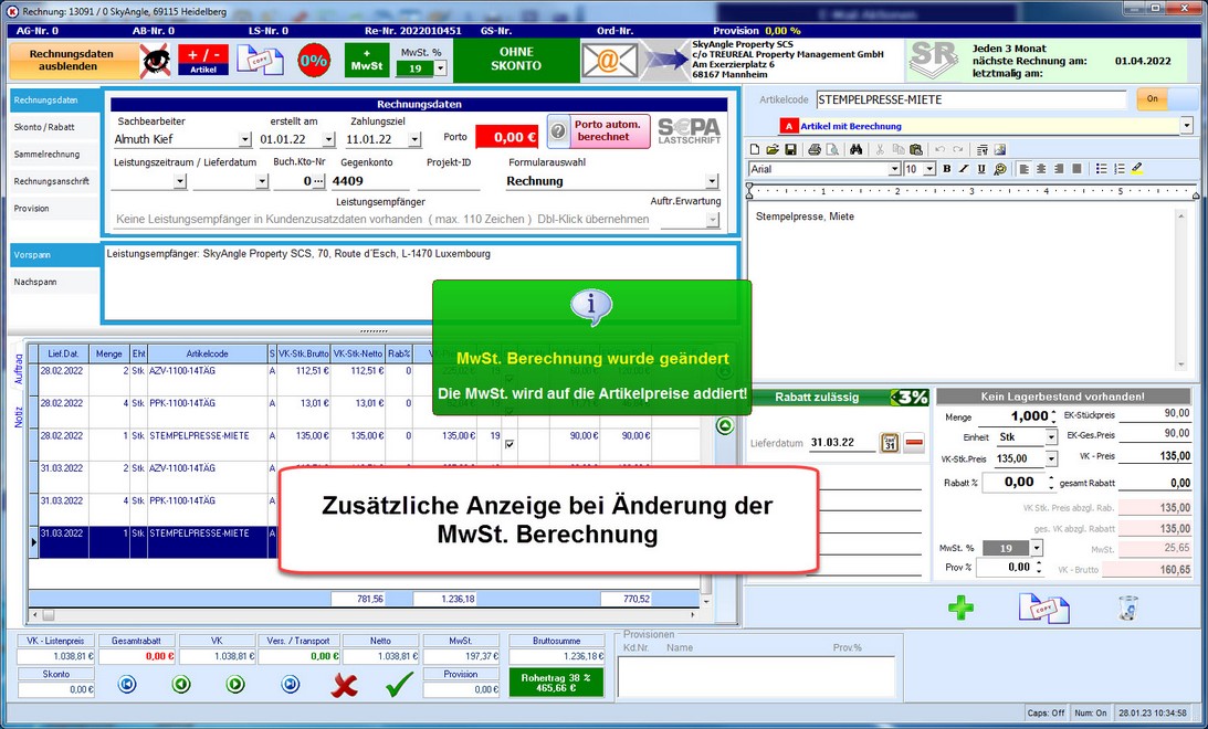 Durch die ständig steigenden Energiepreise müssen einige User die Transportkosten in Ihren Rechnungen / Sammelrechnungen anpassen. Da aber nicht alle Artikel automatisch erhöht werden sollen muss der Artikelstatus in der Auftragsverwaltung gekennzeichnet werden. Somit können dann z. B. alle Rechnungsartikel mit dem Status "T" für Transportkosten um x % erhöht werden. Das betrifft natürlich auch Artikel mit "V" Versandkosten etc. falls Versand- bzw. Verpadckungskosten gestiegen sind. Sollten Sie die Angebote bzw. Rechnungen nach Gewerken berechnen. Muss dann natürlich im Reportgenerator angepasst werden!