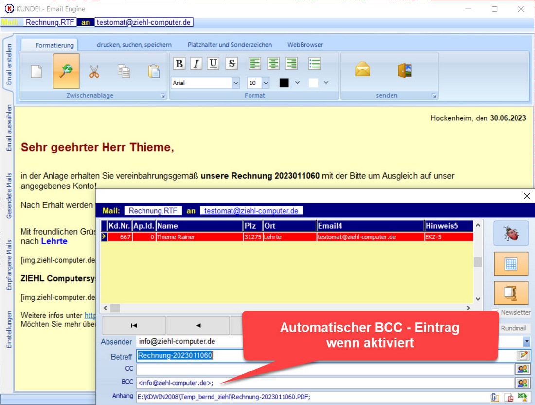 Beim Versenden von E-Mails über die Rechnungsübersicht werden BCC Mails auch verschickt sofern in den Systemeinstellungen eine BCC - Adresse eingetragen wurde.