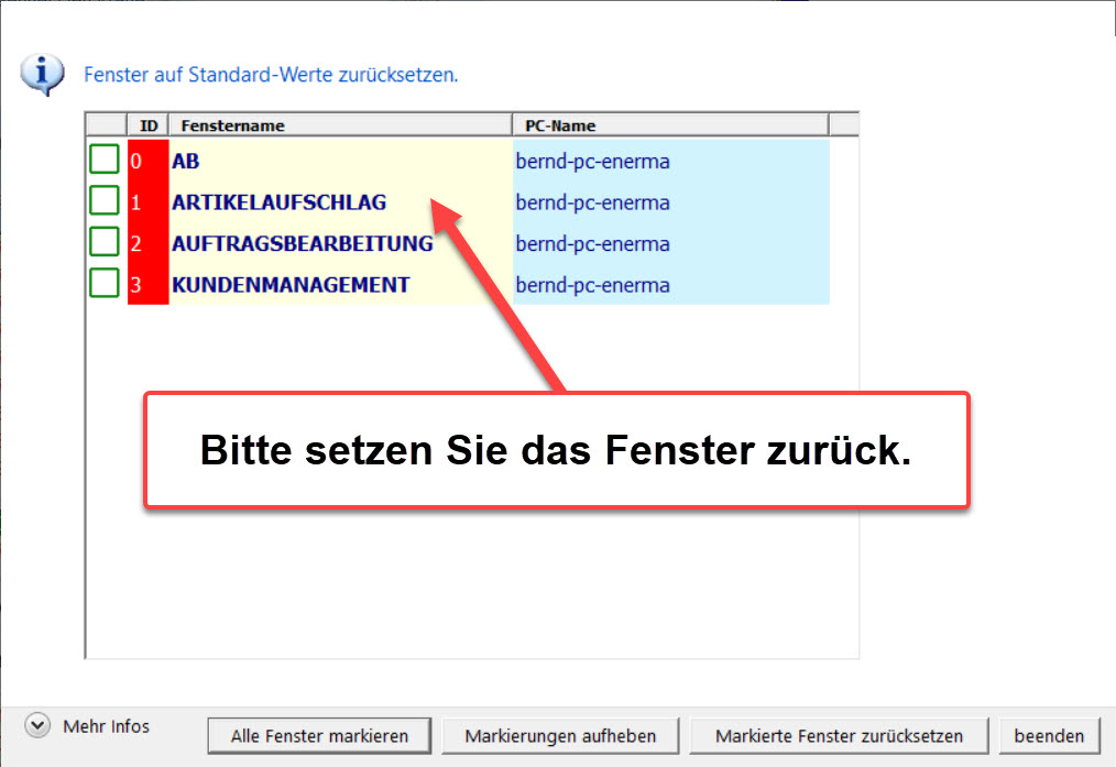 ACHTUNG! Setzen Sie das Fenster zurück damit das obige Fenster korrekt dargestellt werden kann!