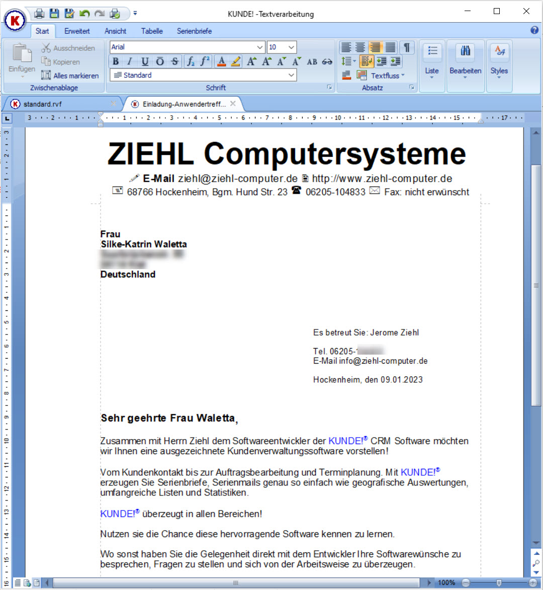 Mit der KUNDE! eigenen Textverarbeitung schreiben Sie blitzschnell Serienbriefe an Ihre Kunden.